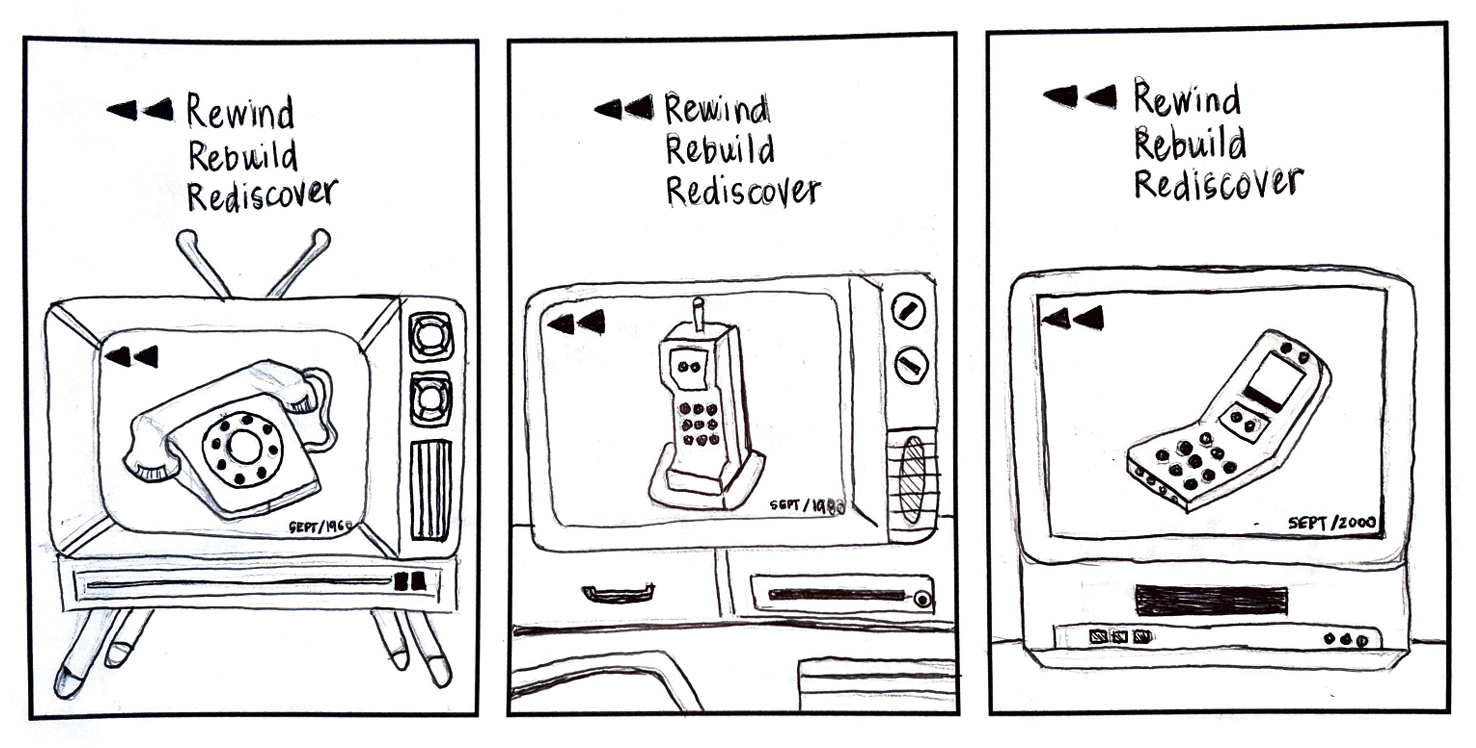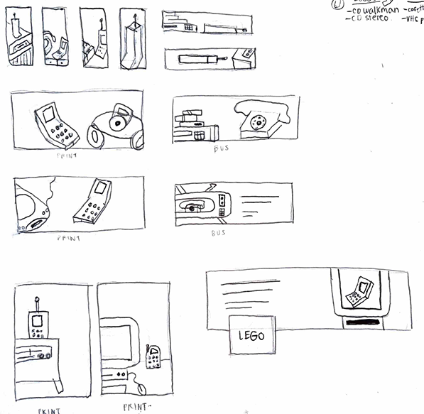 After feedback, I explored other sketches within different ad sizes for more variety to display the phone model to include other technology (still including a TV version) that was pertinent to corresponding era.