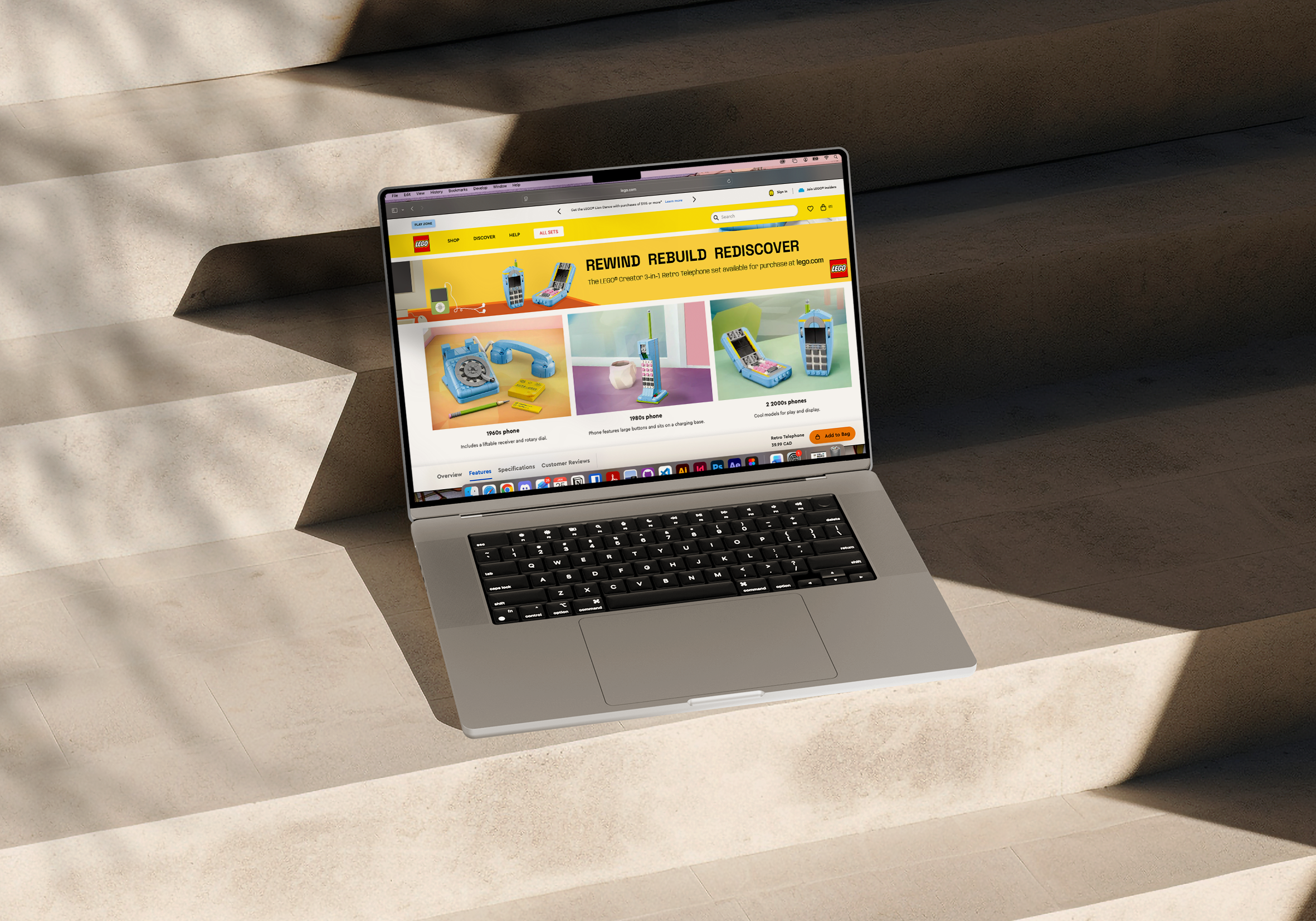 Each phone model within a setting that would reflect its time era. For instance, a calendar and an item that was significant during that decade are shown beside the LEGO phone. Each ad could incorporate a colour aesthetic found during that time.