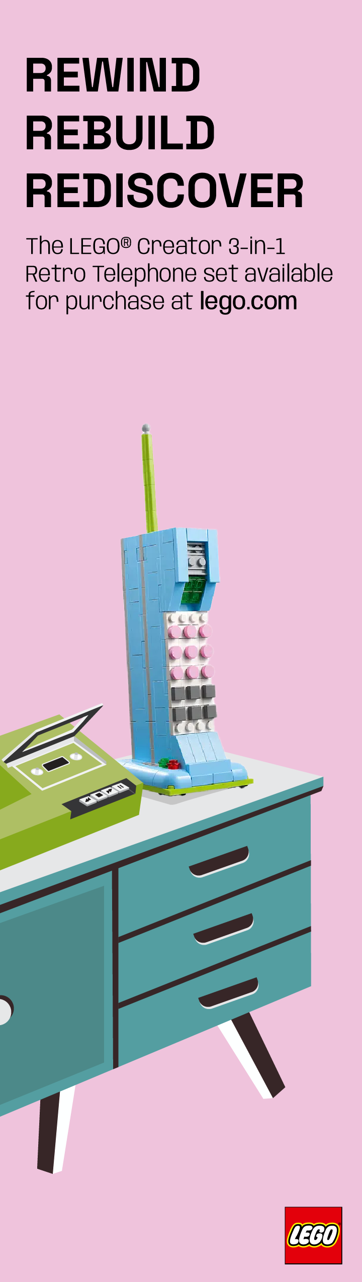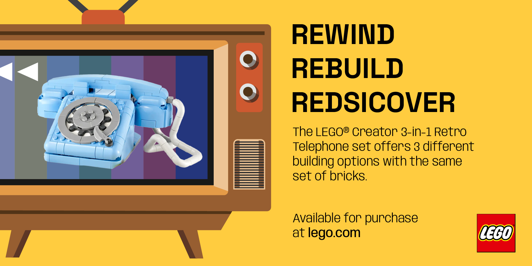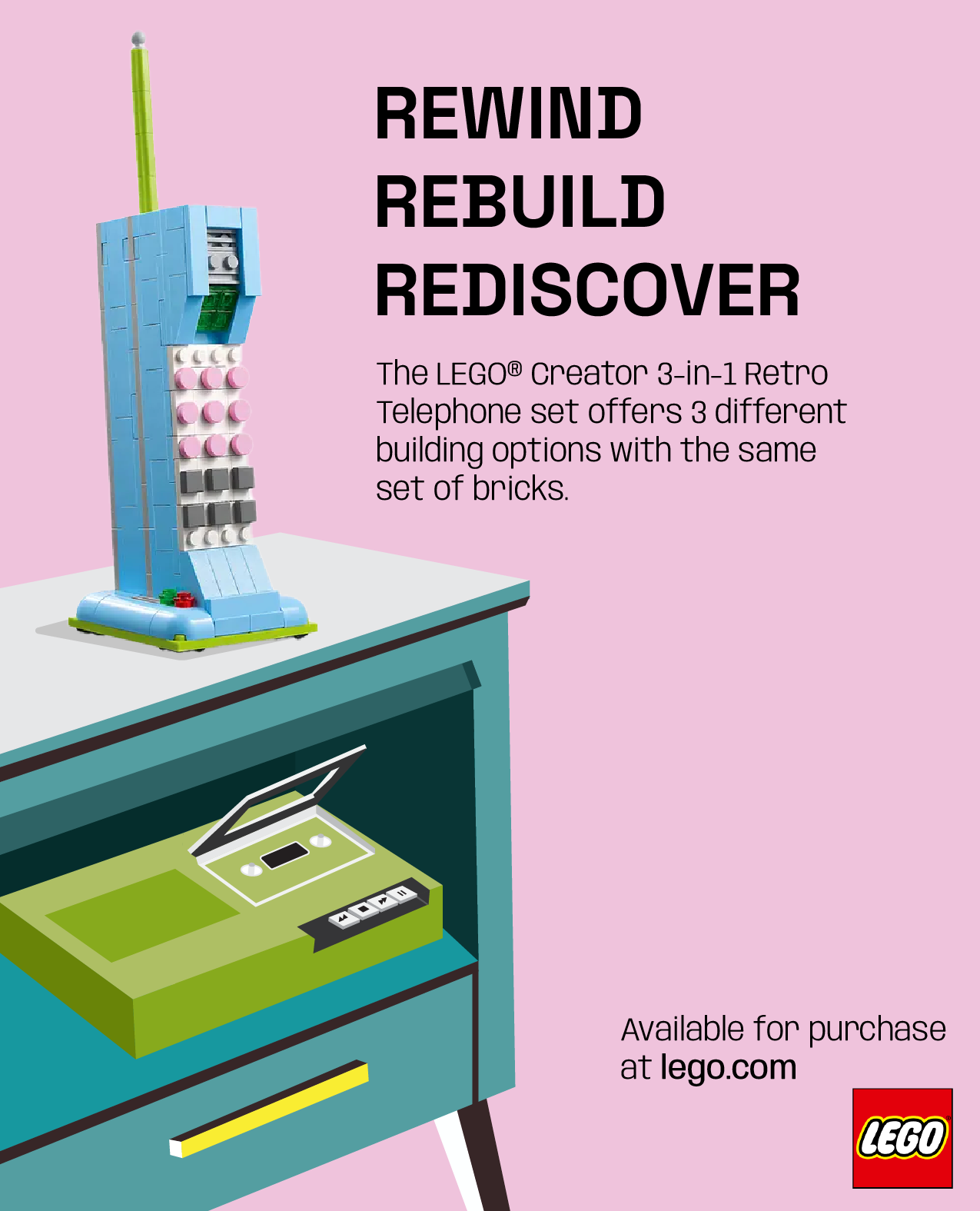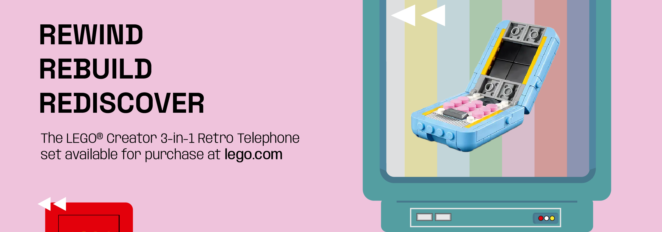 Tagline: Rewind Rebuild Rediscover, Rewind: highlights the rewind symbol (2 side triangles) from VCR tapes and idea of traveling back in time. Rebuild: represents the versatility of building Lego pieces. Rediscover: reconnecting with memories from the past.