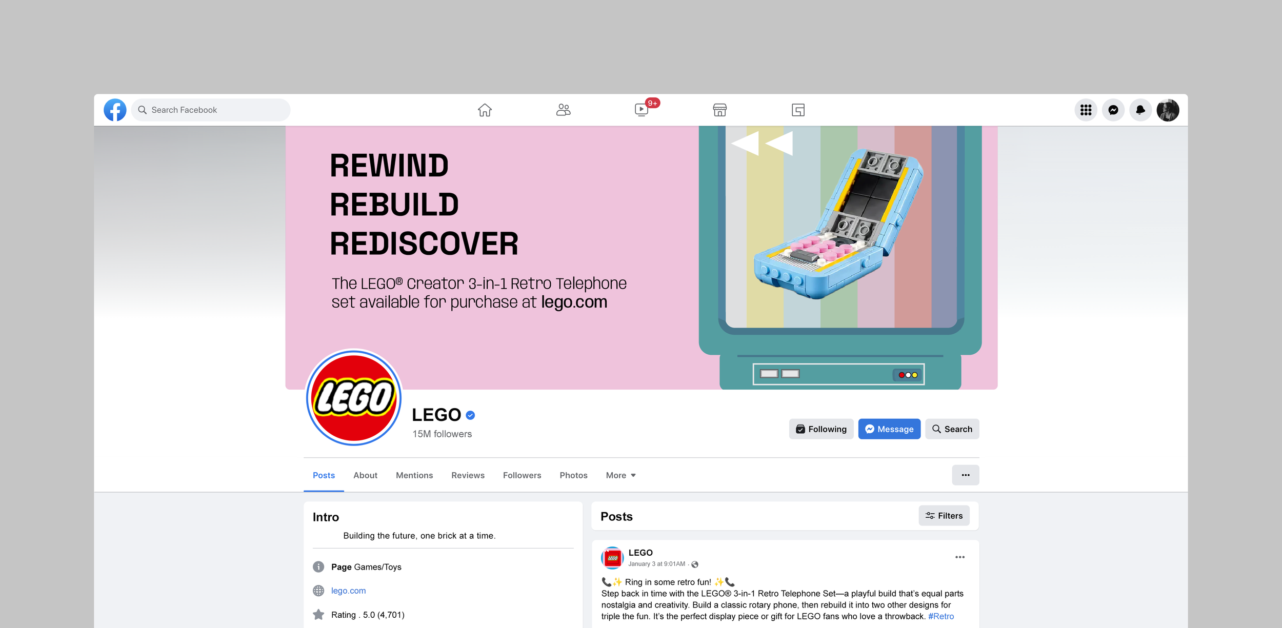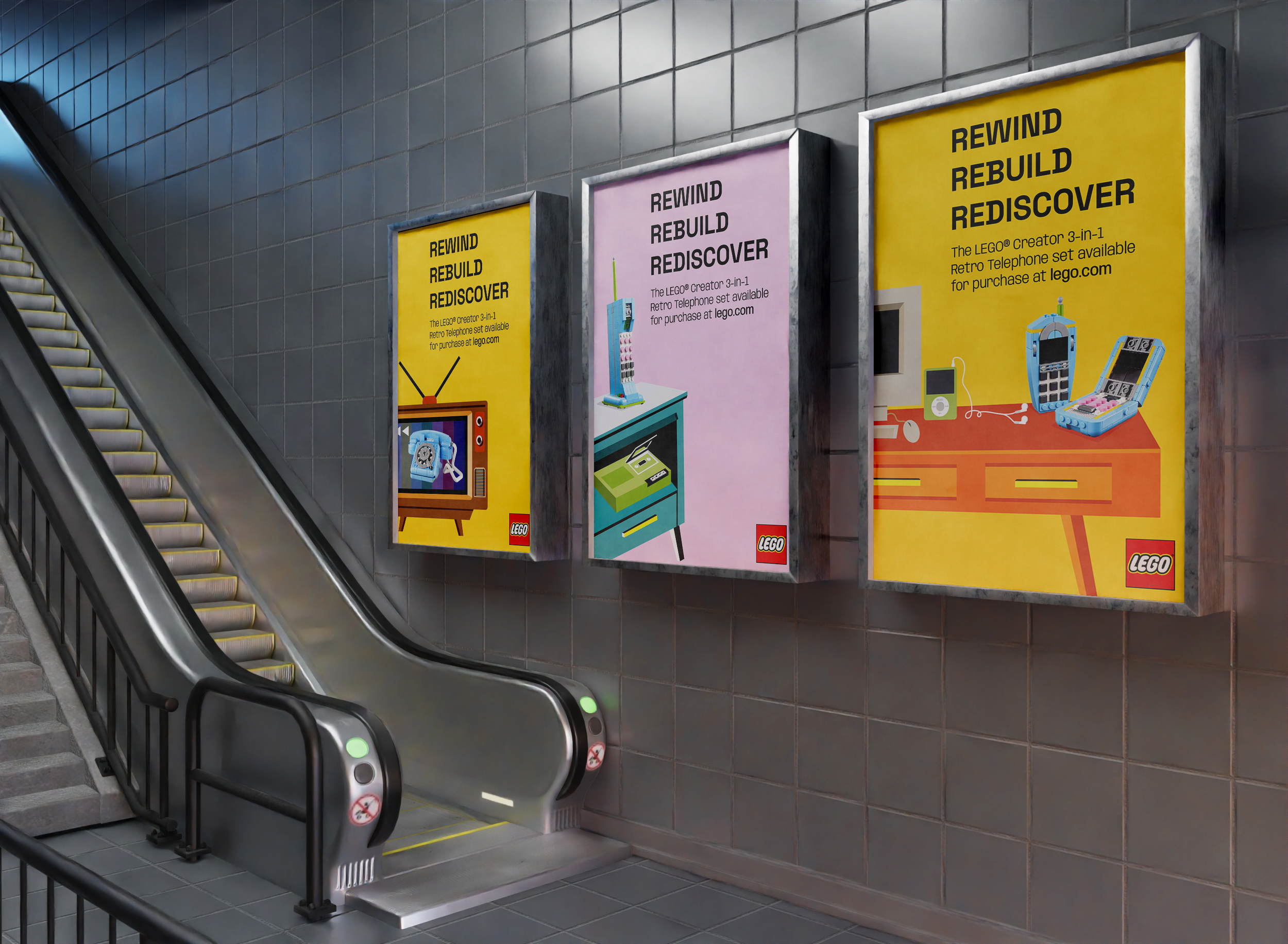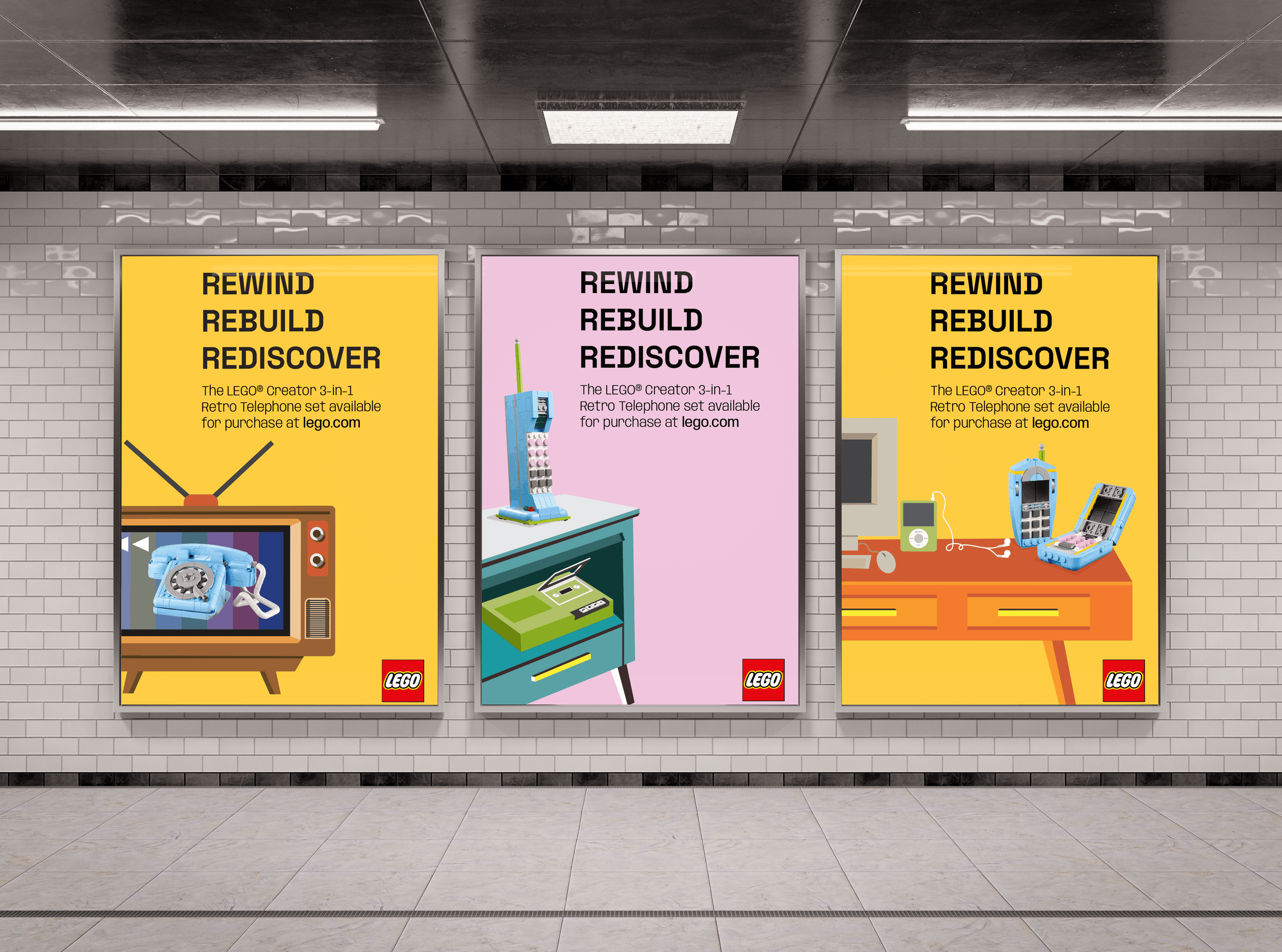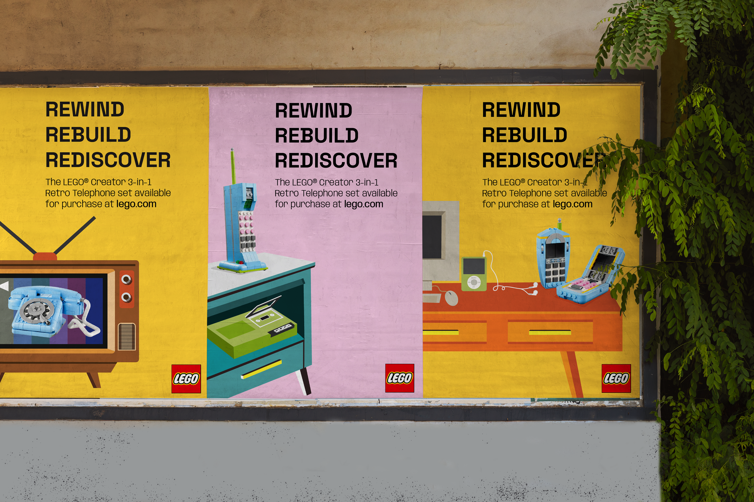 Tagline: Rewind Rebuild Rediscover, Rewind: highlights the rewind symbol (2 side triangles) from VCR tapes and idea of traveling back in time. Rebuild: represents the versatility of building Lego pieces. Rediscover: reconnecting with memories from the past.